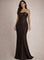 This chocolate brown co-ord set includes a structured tube blouse with delicate handwork detailing and a gold chain detail at the back. It is paired with a silk satin maxi skirt featuring an elasticated waistband for comfort and a snatched waist look.